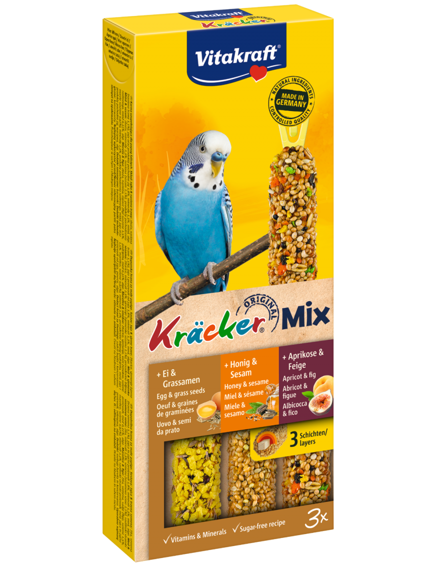 Jedna kolba Kräcker powinna zawsze znajdować się w klatce. Regularnie uzupełniaj, aby wspierać naturalne żerowanie, aktywność i dobry nastrój ptaków.