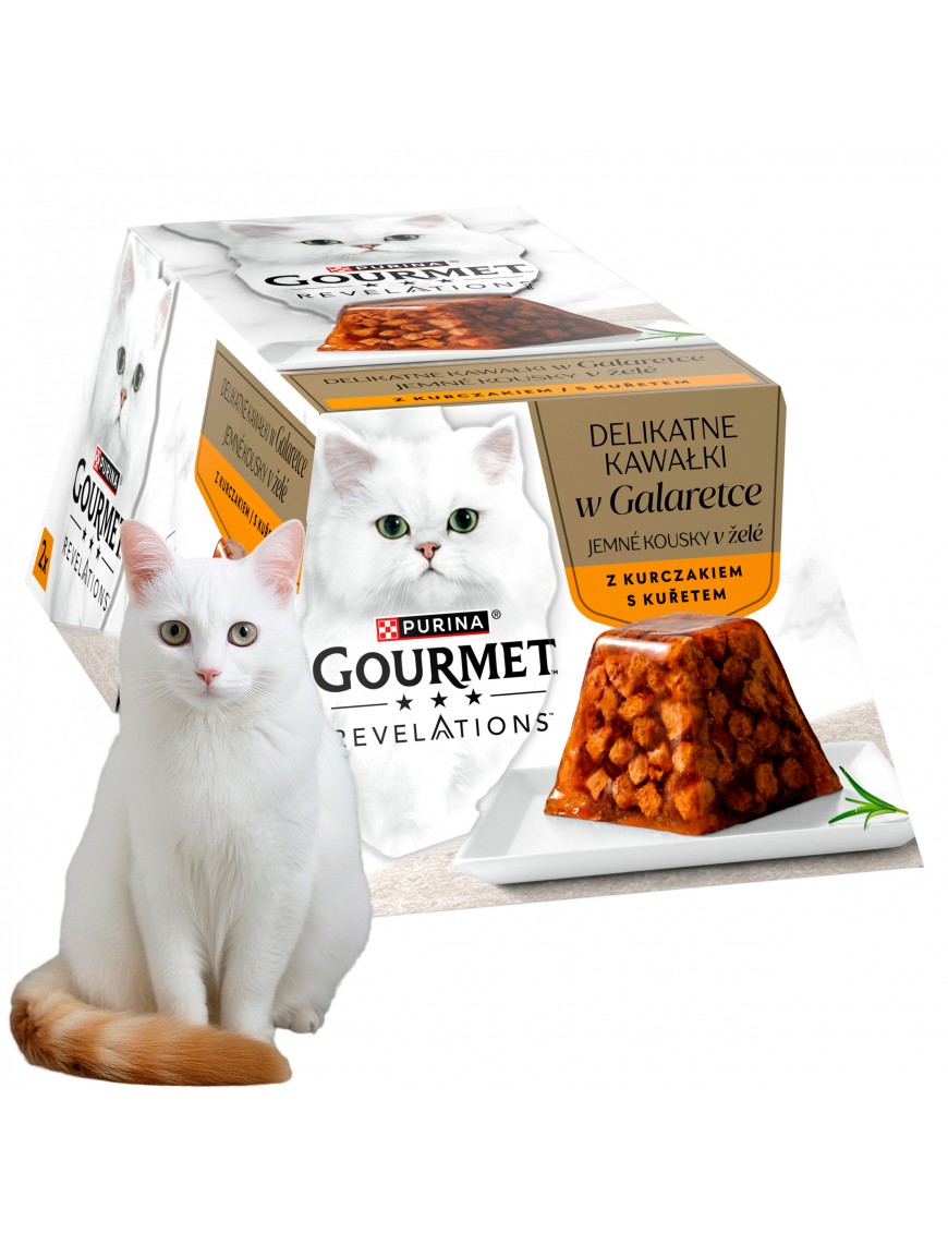 Gourmet Revelations to smakowita, kompletna karma mokra w innowacyjnej formie piramidek, stworzona z myślą o kocich smakoszach. Zawiera wysokiej jakości składniki bez sztucznych dodatków, barwników i konserwantów. Delikatna galaretka i miękkie kawałki kurczaka sprawiają, że każdy posiłek jest prawdziwą przyjemnością dla kota.