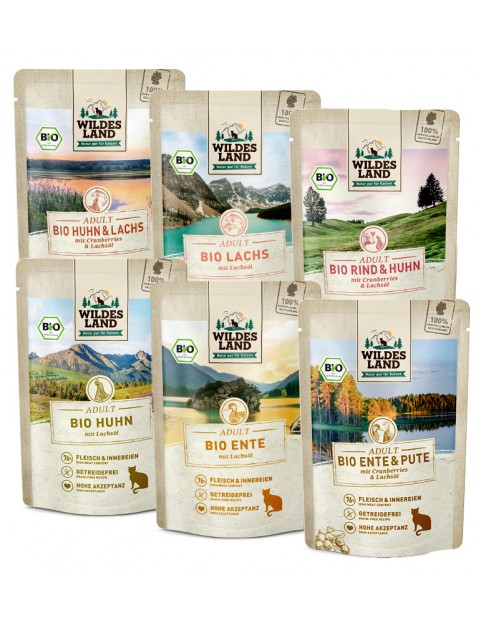 100% natury, 100% smaku – czysta przyjemność w ekologicznej formie! Wildes Land Bio Pouch Trial Box to zestaw sześciu pełnoporcjowych, organicznych karm mokrych dla dorosłych kotów. Każda saszetka to porcja zdrowia i naturalnego smaku, przygotowana z minimum 76% mięsa i podrobów pochodzących z certyfikowanych upraw ekologicznych. Dodatek oleju z łososia zapewnia błyszczącą sierść i wspiera odporność, a delikatna obróbka składników gwarantuje doskonałą tolerancję nawet u kotów wrażliwych.