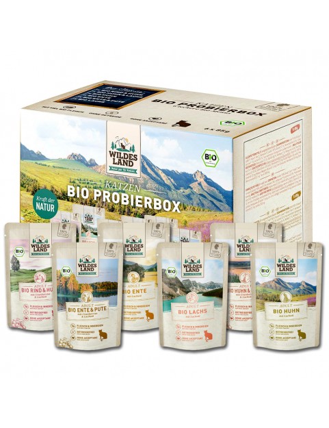 Podaruj swojemu kotu smak czystej natury! Wildes Land Bio Pouch Trial Box to idealny sposób, by odkryć różnorodność organicznych receptur – zdrowych, naturalnych i niezwykle smakowitych, stworzonych z miłości do zwierząt i w trosce o ich dobrostan.