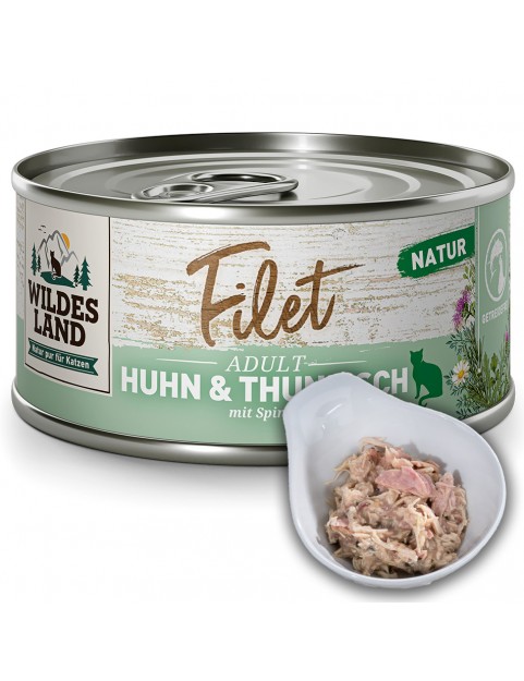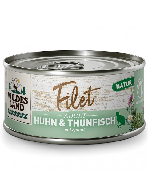 Podaruj swojej kotce smak, który łączy to, co najlepsze z lądu i morza! Wildes Land Filet Huhn & Thunfisch mit Spinat to wyjątkowa mokra karma dla kotów, w której delikatne mięso z kurczaka spotyka się z aromatycznym filetem z tuńczyka. Całość została delikatnie ugotowana we własnym sosie, by zachować naturalny smak i wartości odżywcze. To propozycja stworzona z myślą o kotach, które kochają różnorodność i zasługują na najwyższą jakość w misce.