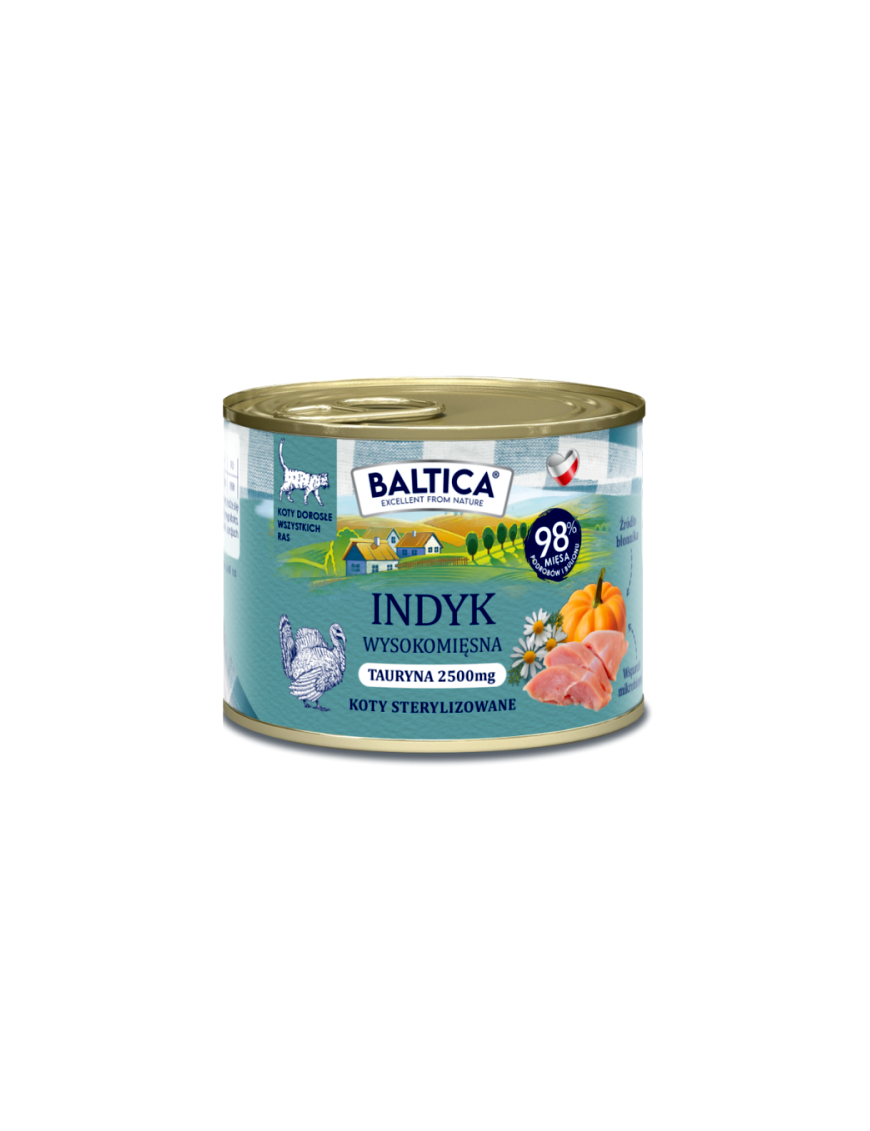Twój kot zasługuje na naturalne, lekkostrawne żywienie. BALTICA Smaki Regionów Indyk to pełnoporcjowa, monoproteinowa karma mokra, stworzona z delikatnego mięsa indyka – idealna dla kotów dorosłych, po sterylizacji, z nadwagą lub wrażliwym układem pokarmowym. Zapewnia codzienną porcję zdrowia, energii i doskonałego smaku.