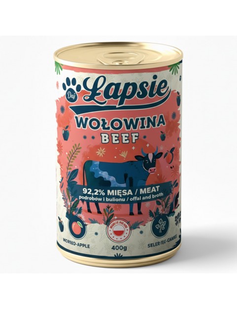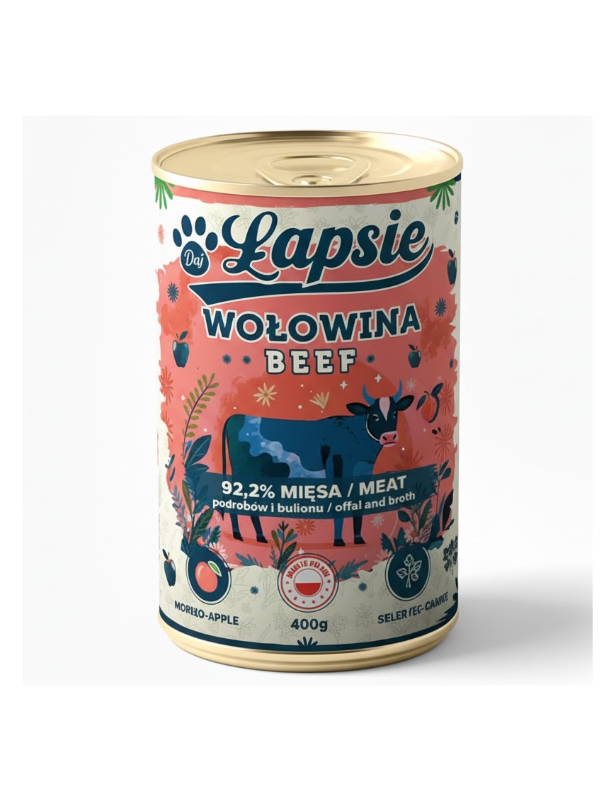 Podaruj swojemu psu smak natury i siłę z wołowiny. Wybierz Łapsie Mono z wołowiną – codzienny posiłek pełen energii, zdrowia i miłości, na który Twój pies będzie czekał z merdającym ogonem!
