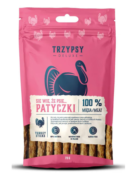 TRZYPSY DELUXE sie wie, że psie... patyczki z indyka to w pełni naturalne, miękkie przysmaki dla psów, wyprodukowane ze 100% mięsa w formie patyczków. Jeden patyczek ma około 11,5 cm długości i jest bardzo łatwy do podzielenia. Nie zawierają konserwantów, barwników, sztucznych wypełniaczy. Przysmak jest niezwykle aromatyczny i pożywny, stanowi doskonałe uzupełnienie codziennej diety każdego pupila. Idealnie sprawdzą się jako nagroda.