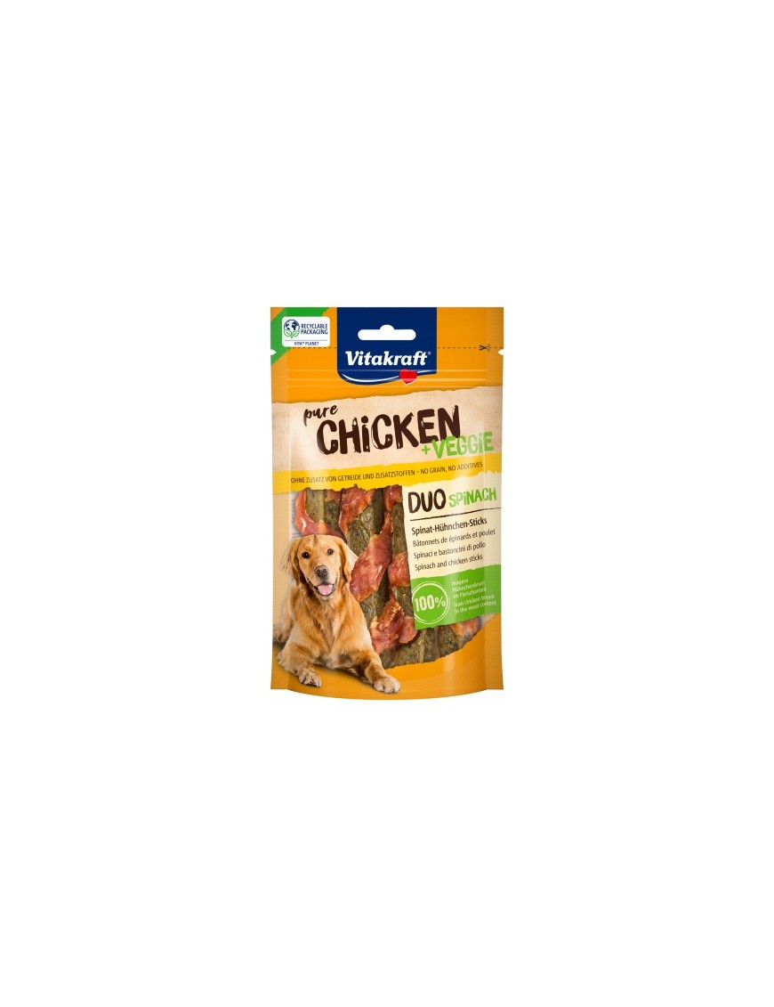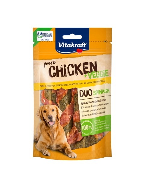 Podaruj swojemu psu Vitakraft Chicken Duo Veggie szpinak + kurczak – zdrową, pyszną nagrodę, która wspiera jego energię i radość życia.