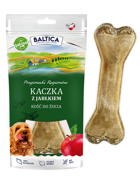 Podaruj swojemu psu zdrową i pyszną przekąskę ?. Baltica Przysmaki Regionów Kość do żucia z kaczką i jabłkiem to naturalny gryzak stworzony z myślą o dorosłych psach oraz szczeniakach od 4. miesiąca życia. Smakowite połączenie soczystej kaczki z owocową nutą jabłka sprawia, że Twój pupil nie oprze się tej wyjątkowej przekąsce.