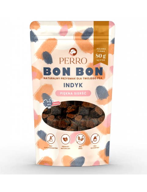 Podaruj swojemu psu coś więcej niż przysmak. PERRO BON BON Indyk – piękna sierść to pyszna nagroda, która nie tylko sprawia radość, ale też wspiera codzienne zdrowie, blask i witalność Twojego pupila.