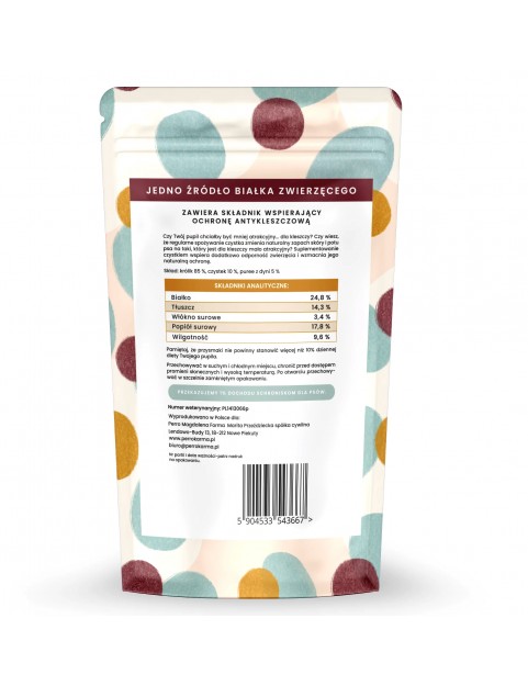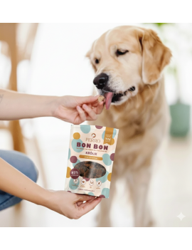 Mięso królika to jedno z najdelikatniejszych źródeł białka – rzadko wywołuje alergie, a przy tym dostarcza cennych witamin z grupy B, fosforu, niacyny i cynku. Zawarty w nim kwas linolenowy działa przeciwzapalnie, wspiera odporność i dobre samopoczucie psa. Czystek to roślinny tarczownik – wspiera organizm w walce z wirusami, bakteriami i grzybami, a także działa odstraszająco na kleszcze. Dodatek puree z dyni reguluje trawienie i wspiera pracę układu pokarmowego oraz krążeniowego. Wszystko w formie smakowitych kąsków, bez zbóż, gliceryny i sztucznych dodatków.