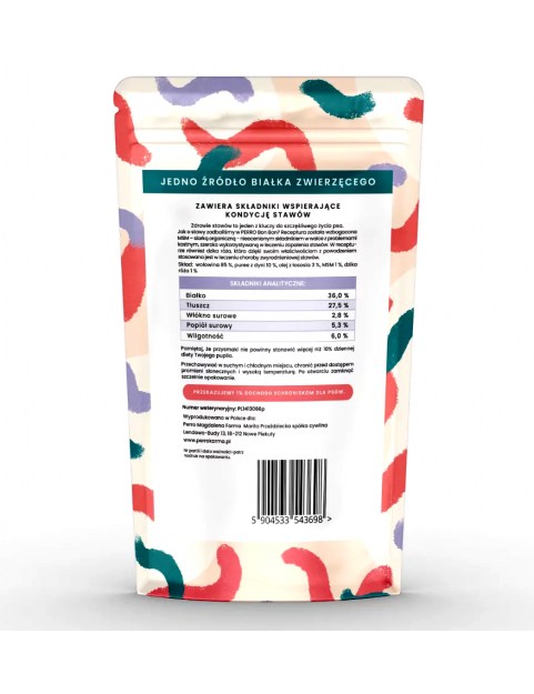 Wołowina to źródło łatwo przyswajalnego żelaza, witamin z grupy A, B i E oraz kreatyny i L-karnityny – składników poprawiających wydolność i tempo regeneracji. Puree z dyni wspiera układ krążenia i trawienie, a olej z łososia łagodzi stany zapalne stawów i wspomaga ich elastyczność. MSM – organiczny związek siarki – jest niezbędnym elementem kolagenu, działa przeciwbólowo i przeciwzapalnie. Dzika róża, bogata w witaminę C, wzmacnia wchłanianie MSM i wspiera kondycję stawów. To funkcjonalna przekąska o pysznym smaku, idealna do codziennego stosowania.