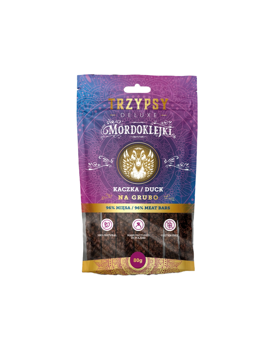 Twój pies kocha gryźć – Ty chcesz, by robił to zdrowo! Trzypsy Deluxe Mordoklejki na Grubo to półmiękkie, aromatyczne batoniki z kaczki, które zapewnią Twojemu pupilowi chwilę pysznej przyjemności i wsparcie dla zdrowia jamy ustnej. Idealne na nagrodę, spacer lub po prostu – z miłości do czworonożnego przyjaciela.