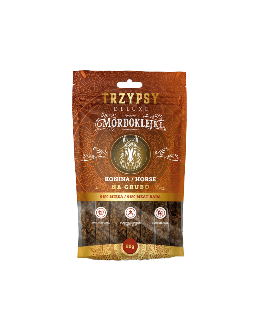 Dla psów, które lubią gryźć dłużej i intensywniej! Trzypsy Deluxe Mordoklejki na Grubo z Koniny to grubsze, półmiękkie batony stworzone z myślą o psach, które cenią sobie konkretne porcje smaku. Naturalny skład, wyjątkowy aromat i mięsna konsystencja sprawiają, że każdy kęs to czysta przyjemność i zdrowe wsparcie codziennej diety Twojego pupila.