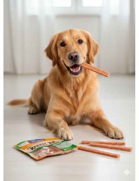 Każdy pasek powstaje z chudego mięsa króliczego, które jest jednym z najbardziej delikatnych i najlepiej tolerowanych źródeł białka. Przysmak nie zawiera zbóż, cukru, soi, jaj, nabiału ani mączek mięsnych, co czyni go świetną opcją dla psów o wrażliwym układzie trawiennym lub alergików. Opakowanie w formie praktycznej, zamykanej torby ułatwia przechowywanie i pomaga ograniczać zużycie plastiku.