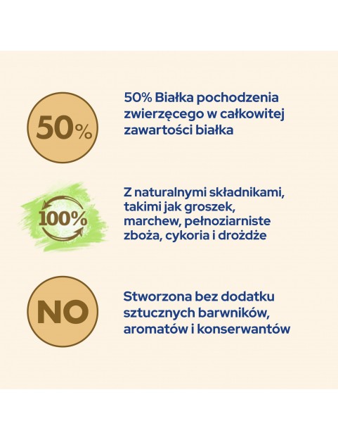 Karma zawiera pełnoziarniste zboża (41%) oraz mięso i produkty pochodzenia zwierzęcego (25%), w tym indyka (4%) – lekkostrawne źródło białka wysokiej jakości. Obniżona zawartość tłuszczu (9%) pomaga utrzymać prawidłową masę ciała po sterylizacji, a odpowiedni poziom białka (35%) wspiera zachowanie mięśni. Dodatek naturalnych warzyw (cykoria, marchew, groszek) oraz drożdży wspomaga trawienie, odporność i zdrową florę jelitową. Karma nie zawiera sztucznych barwników ani konserwantów – tylko naturalne składniki dla codziennej równowagi Twojego kota.