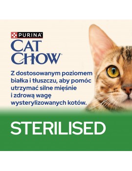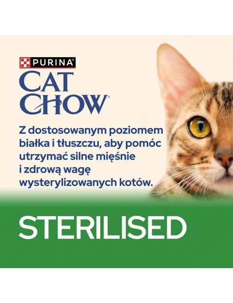 Twój kot po sterylizacji potrzebuje specjalnie zbilansowanej diety, która zadba o jego zdrowie, energię i odpowiednią wagę. ? CAT CHOW Sterilised z Indykiem to sucha karma opracowana z myślą o dorosłych kotach po zabiegu kastracji lub sterylizacji. Jej receptura wspiera naturalny metabolizm, kontroluje wagę i dostarcza wszystkich niezbędnych składników odżywczych – w pysznej, aromatycznej formie.