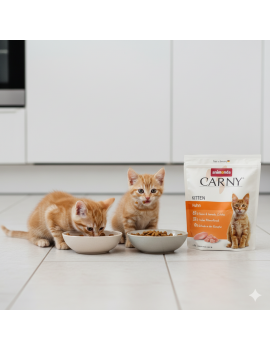 Karma Carny® Kitten to połączenie 65% mięsa i składników zwierzęcych, w tym 35% świeżego kurczaka – źródła lekkostrawnego białka, niezbędnego dla rosnących mięśni. Wysoka zawartość tłuszczu (20%) dostarcza kociętom energii, a olej z łososia jest bogaty w kwasy Omega-3, które wspomagają rozwój mózgu i zdrową, lśniącą sierść. Bezzbożowa formuła bez cukru, soi i sztucznych dodatków chroni delikatny układ pokarmowy młodych kotków.