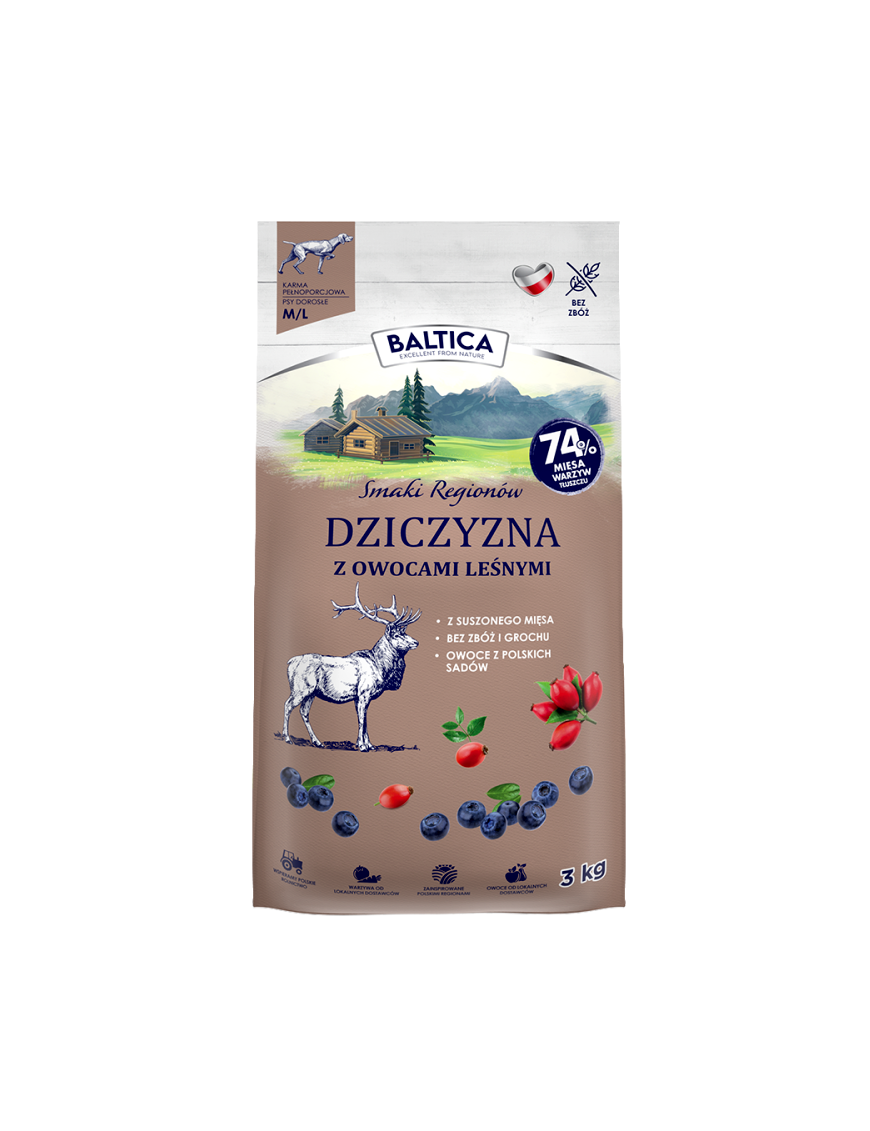 Naturalna moc lasu dla Twojego psa. Baltica Smaki Regionów Dziczyzna z owocami leśnymi to wyjątkowa karma bez zbóż i alergenów, która wspiera zdrowie, odporność i witalność psów średnich i dużych ras – każdego dnia.