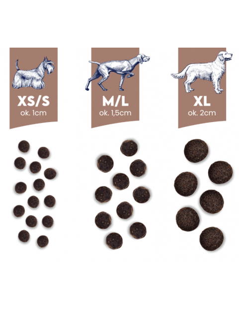 Dziczyzna to doskonałe źródło lekkostrawnego białka oraz żelaza, fosforu i witamin z grupy B, które wspierają układ odpornościowy i prawidłową pracę mięśni. Wieprzowina dostarcza energii i kwasów tłuszczowych wspomagających metabolizm. Owoce leśne – maliny, jagody i dzika róża – to naturalne źródła antyoksydantów, które chronią komórki przed stresem oksydacyjnym i wspomagają odporność. Bataty i pietruszka wspierają zdrowe trawienie, a zioła (ostropest, mięta, koper włoski) wspomagają pracę wątroby i układu pokarmowego. Receptura została wzbogacona o MSM, glukozaminę i chondroitynę – składniki wspierające zdrowie stawów – oraz kwasy omega 3 i 6 dla pięknej sierści i zdrowej skóry. Karma nie zawiera zbóż, grochu ani kurczaka, dzięki czemu jest odpowiednia również dla psów wrażliwych i alergików.